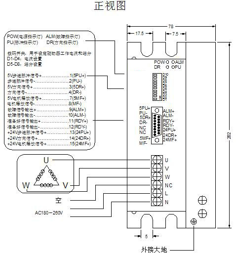 | 13 | 24PU+ | 輸入信號光電隔離正端 | +24V可驅動 | 14 | 24DR+ | 輸入信號光電隔離正端 | +24V可驅動 | 15 | 24MF+ | 輸入信號光電隔離正端 | +24V可驅動 | 電機、電源端 | 1、2 | L、N | 電源 | 電源:AC170-260V | 3 | PE | 地線 | 大地(內接驅動器外殼) | 4 | U | 電機接線 |