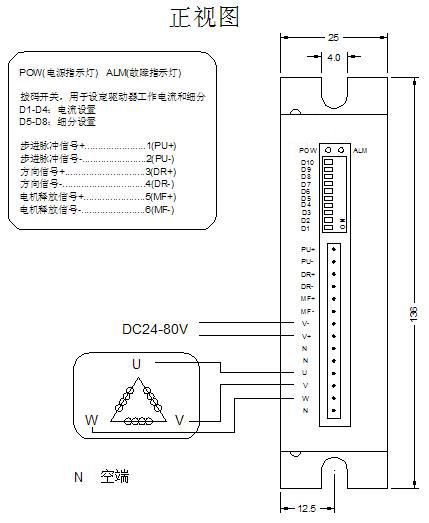 標記符號 | 功能 | 注釋 | PU+ | 輸入信號光電隔離正端 | 接+5V供電電源,+5V-+24V均可驅動,高于+5V需接限流電阻 | PU- | DP9= OFF, PU為步進脈沖信號 | 下降沿有效,每當脈沖由高變低時電機走一步,輸入電阻220Ω,要求:低電平0-0.5V,高電平4-5V,脈沖寬度>2.5Μs | DP9=ON, PU為正相步進脈沖信號 | DR+ | 輸入信號光電隔離正端 | 接+5V供電電源,+5V-+24V均可驅動,高于+5V需接限流電阻 | DR- | DP9= OFF, DR為方向控制信號 | 用于改變電機轉向。輸入電阻220Ω,要求:低電平0-0.5V,高電平4-5V,脈沖寬度>2.5Μs | DP9=ON, DR為反向步進脈沖信號 | MF+ | 輸入信號光電隔離正端 | 接+5V供電電源,+5V-+24V均可驅動,高于+5V需接限流電阻 | MF- | 電機釋放信號 | 有效(低電平)時關斷電機接線電流,驅動器停止工作,電機處于自由狀態 | V- | 電源負 | 電源:DC24-80V | V+ | 電源正 | N | 空端 |